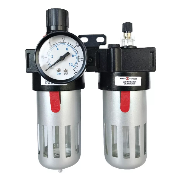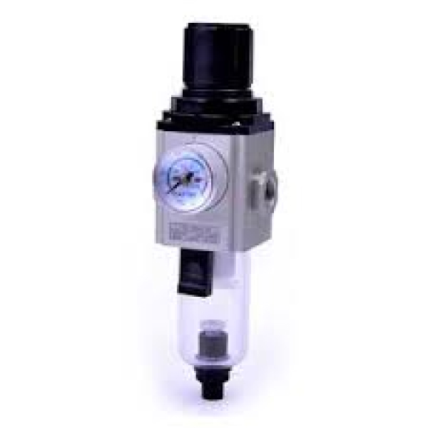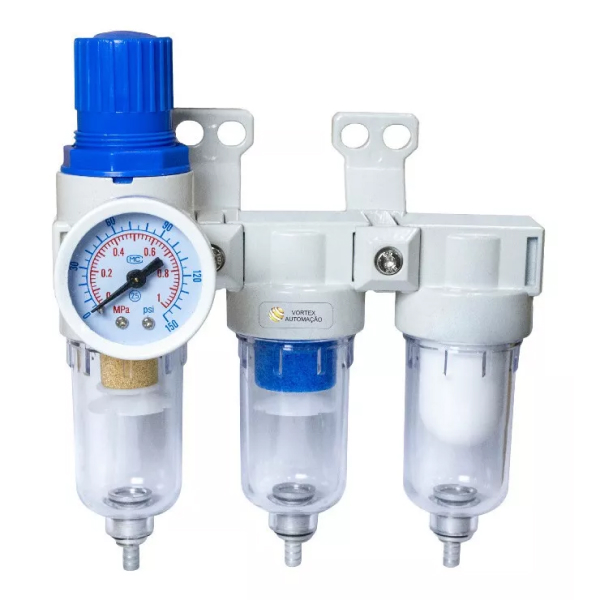 Unidade que reúne filtro e regulador em um só corpo, retendo partículas e estabilizando a pressão do ar comprimido.
