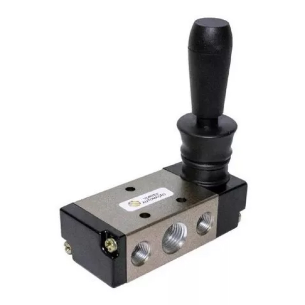 Válvula direcional operada por alavanca, usada para comandar manualmente o fluxo de ar em máquinas e dispositivos pneumáticos.