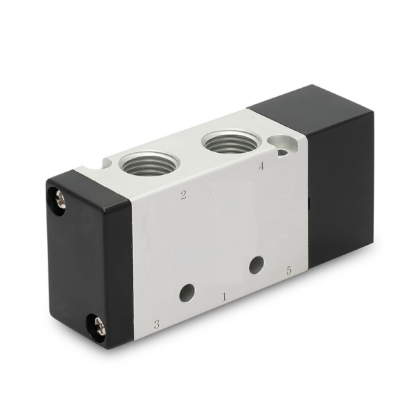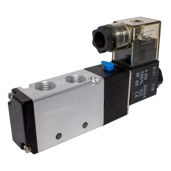 Válvula direcional comandada eletricamente por solenoide, aplicada em painéis e máquinas de automação para controle remoto do fluxo de ar.